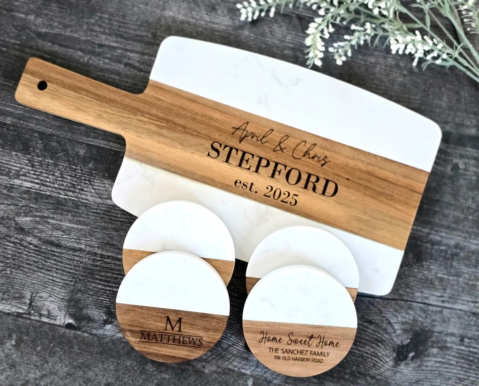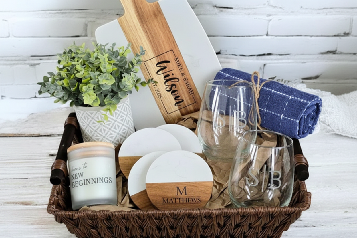 Every piece tells a story — from personalized cutting boards to heartfelt gift baskets and custom drinkware.