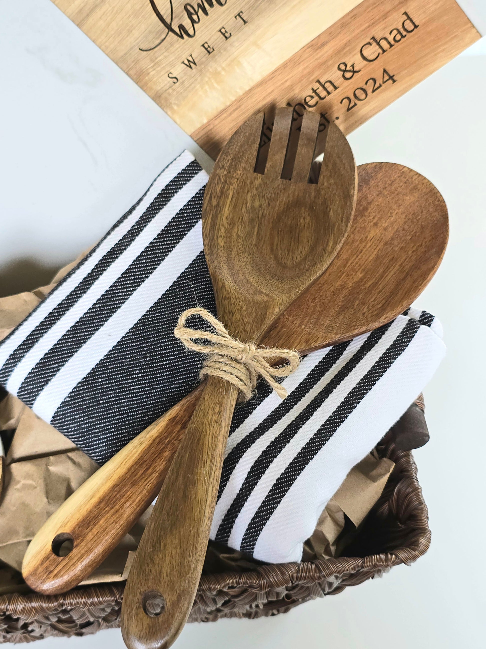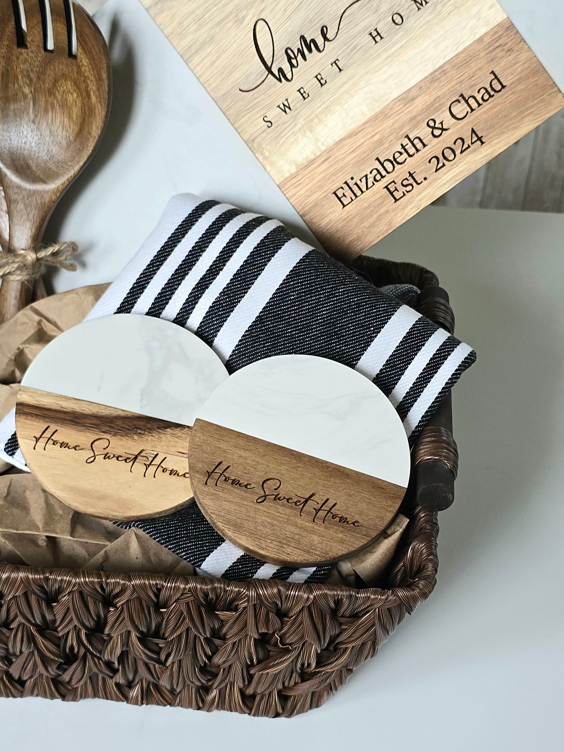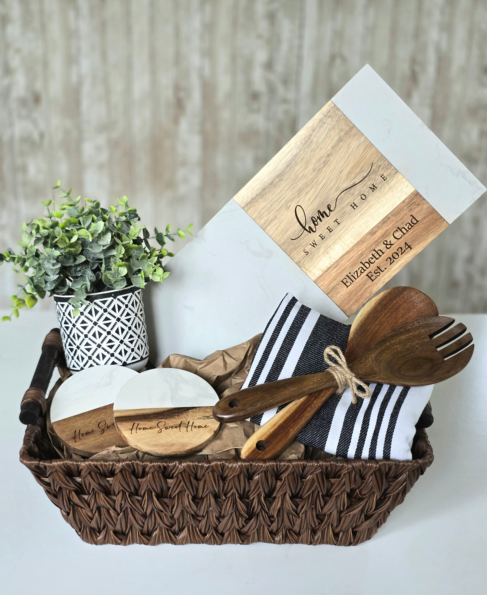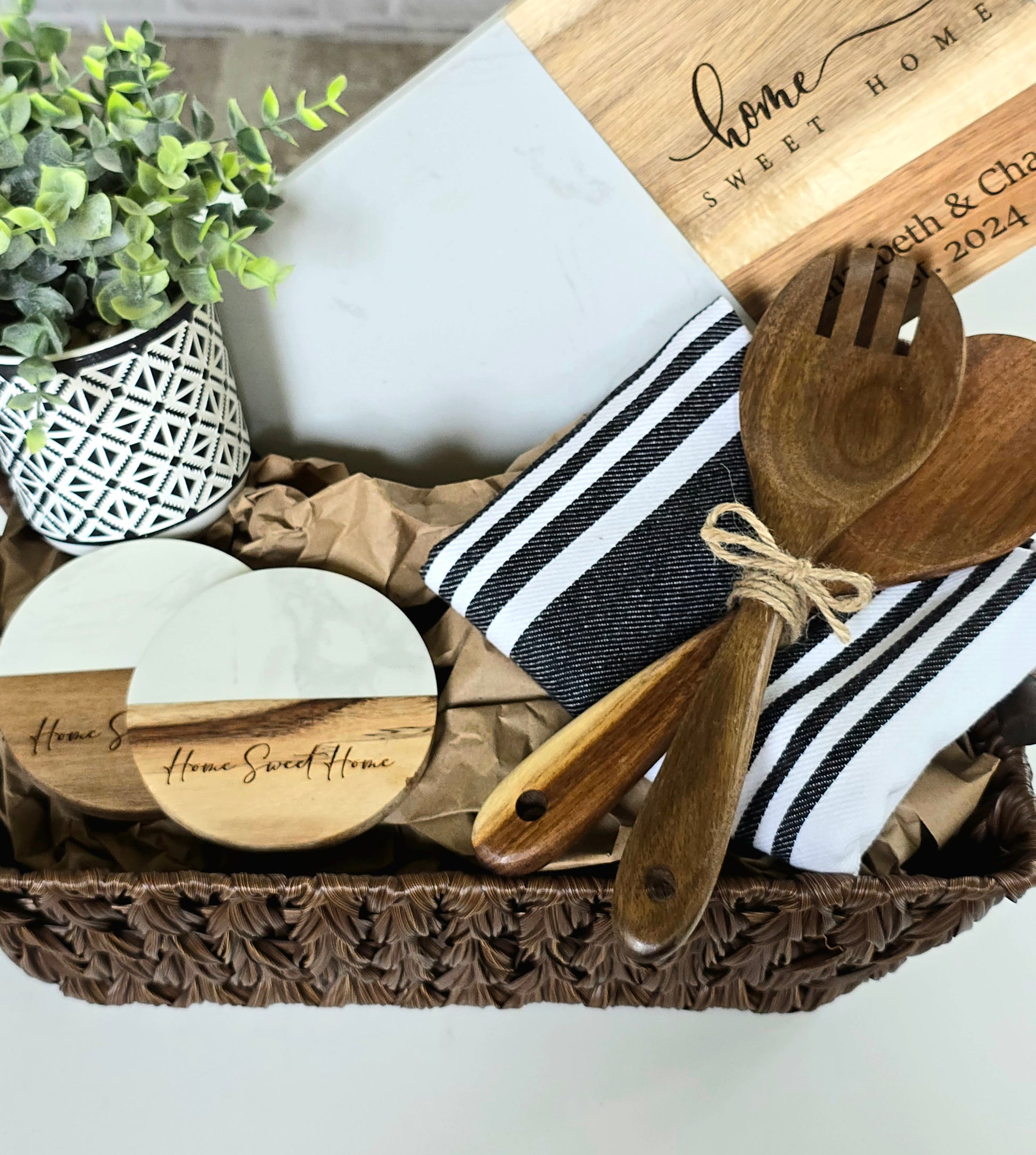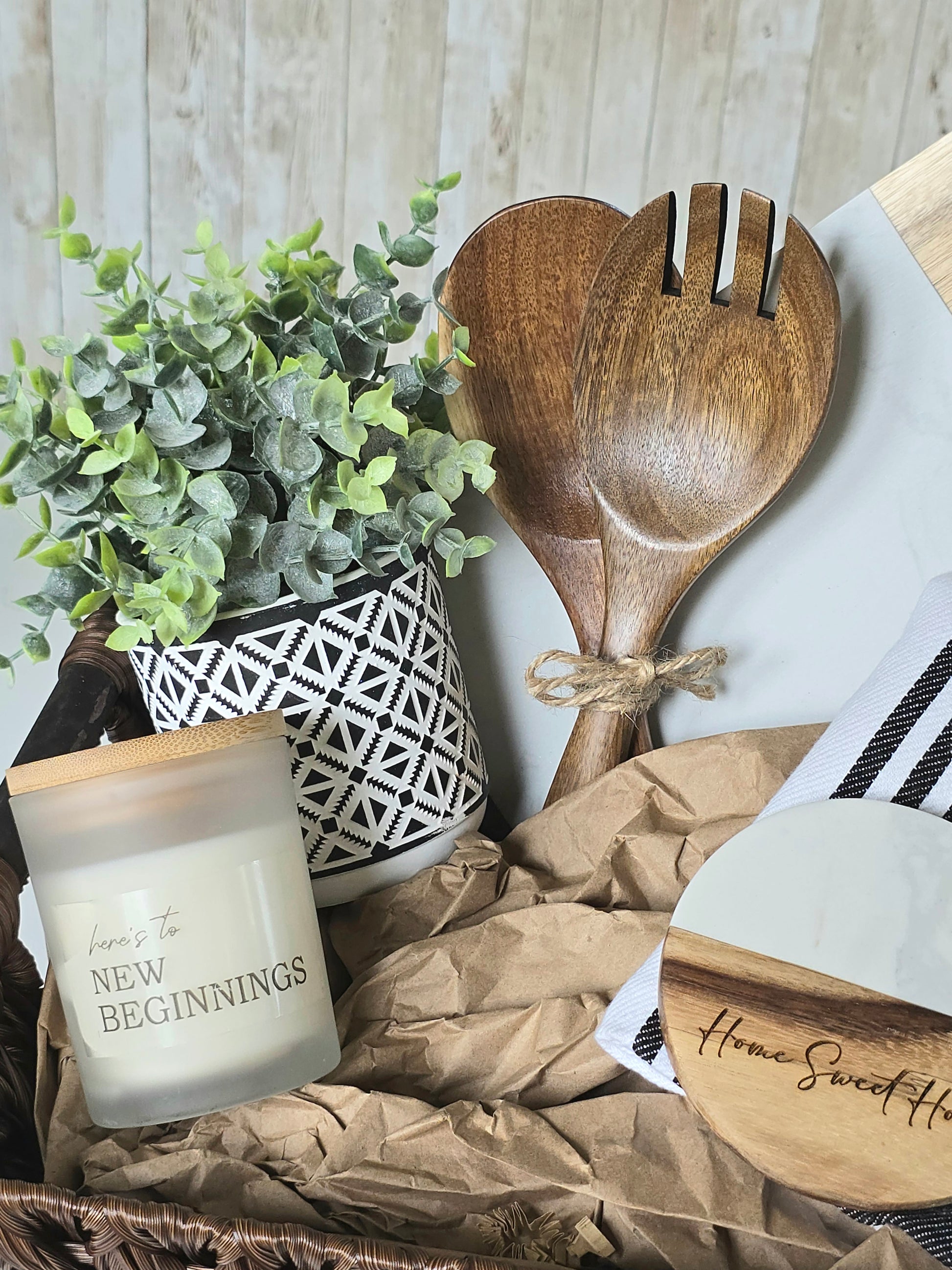 Celebrate a new home with this elegant housewarming basket! Thoughtfully curated, it includes a sleek marble cutting board, stylish marble coasters, a rustic wooden spoon set, a cozy candle, a faux flower for a touch of greenery, and a custom kitchen towel—all arranged in a versatile wicker basket. This gift set combines style and functionality, making it the perfect way to warm any new space! This gift would be a wonderful realtor closing gift, housewarming present, first home gift or a thank you gift.