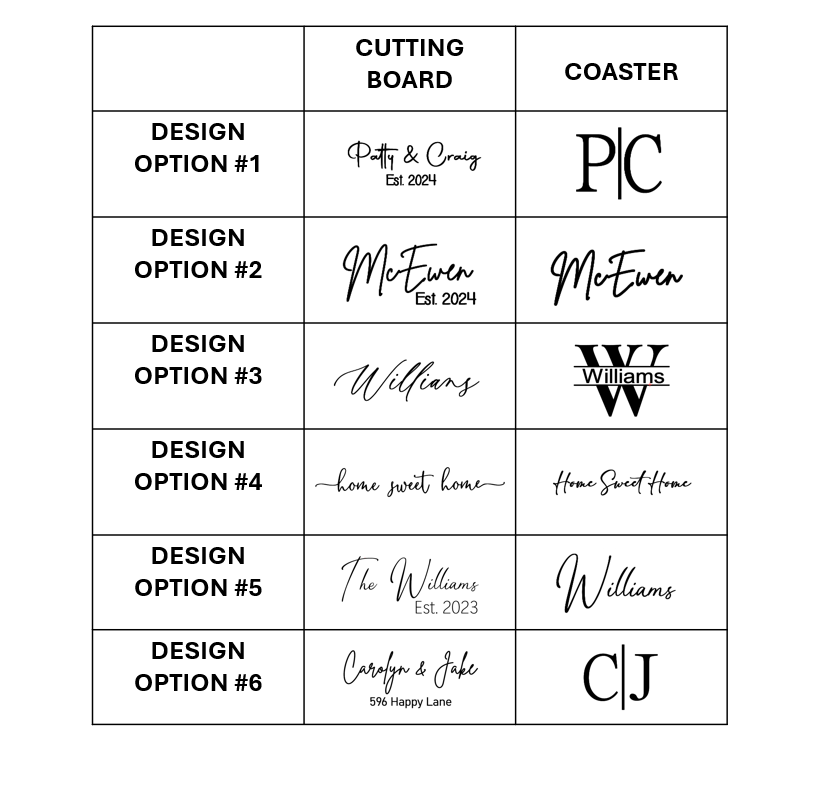 The cutting board and coasters glasses will be engraved based on the design option you choose. There are 20 options to choose from. Should you not see what you are looking for, please feel free to reach out. We will do our very best to accommodate your needs.