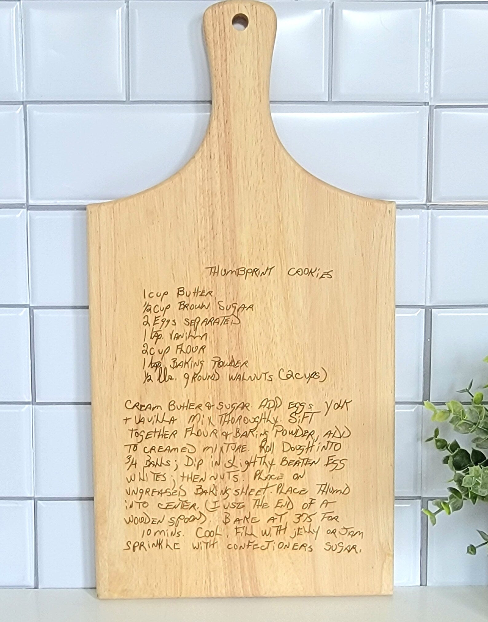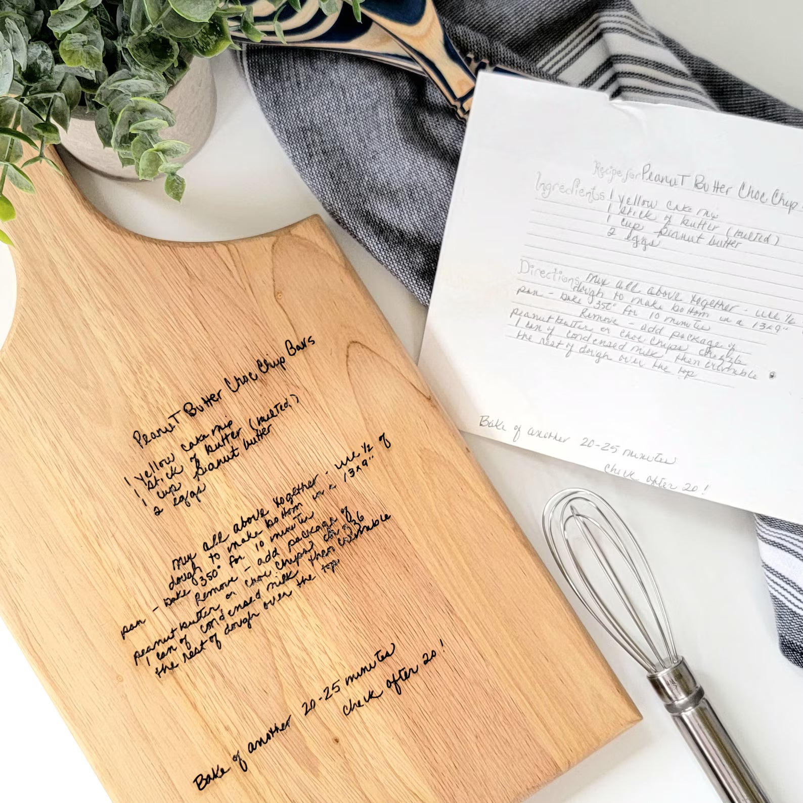 Turn a cherished family recipe into a beautiful keepsake with this personalized cutting board engraved in your loved one’s handwriting. A meaningful gift for moms, grandparents, weddings, housewarmings, and holiday memories.