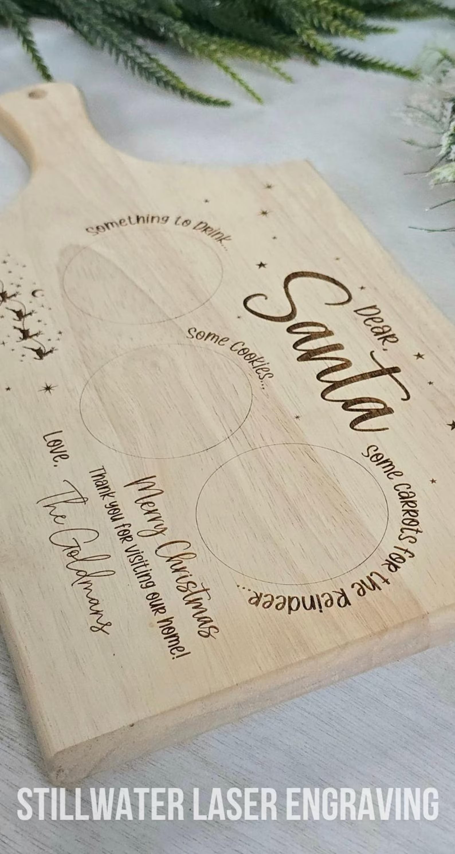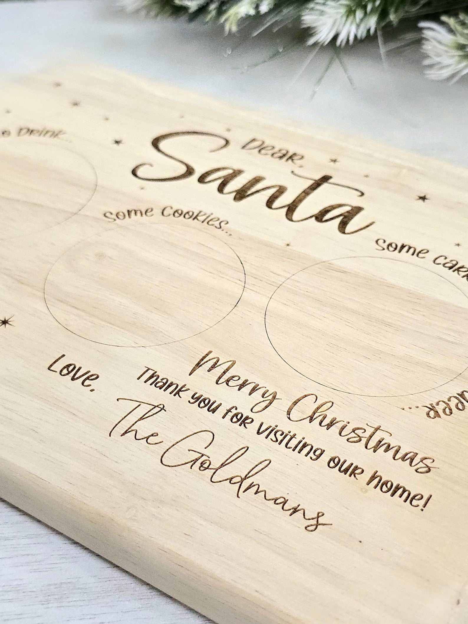 Create a timeless Christmas Eve tradition with this clean and classic Santa treat board. The minimal engraved design features spots for cookies, milk, and reindeer carrots, along with your family name for a personalized touch. Its simple layout makes it perfect for families who love a clean, elegant holiday look while still adding magic to Christmas Eve.