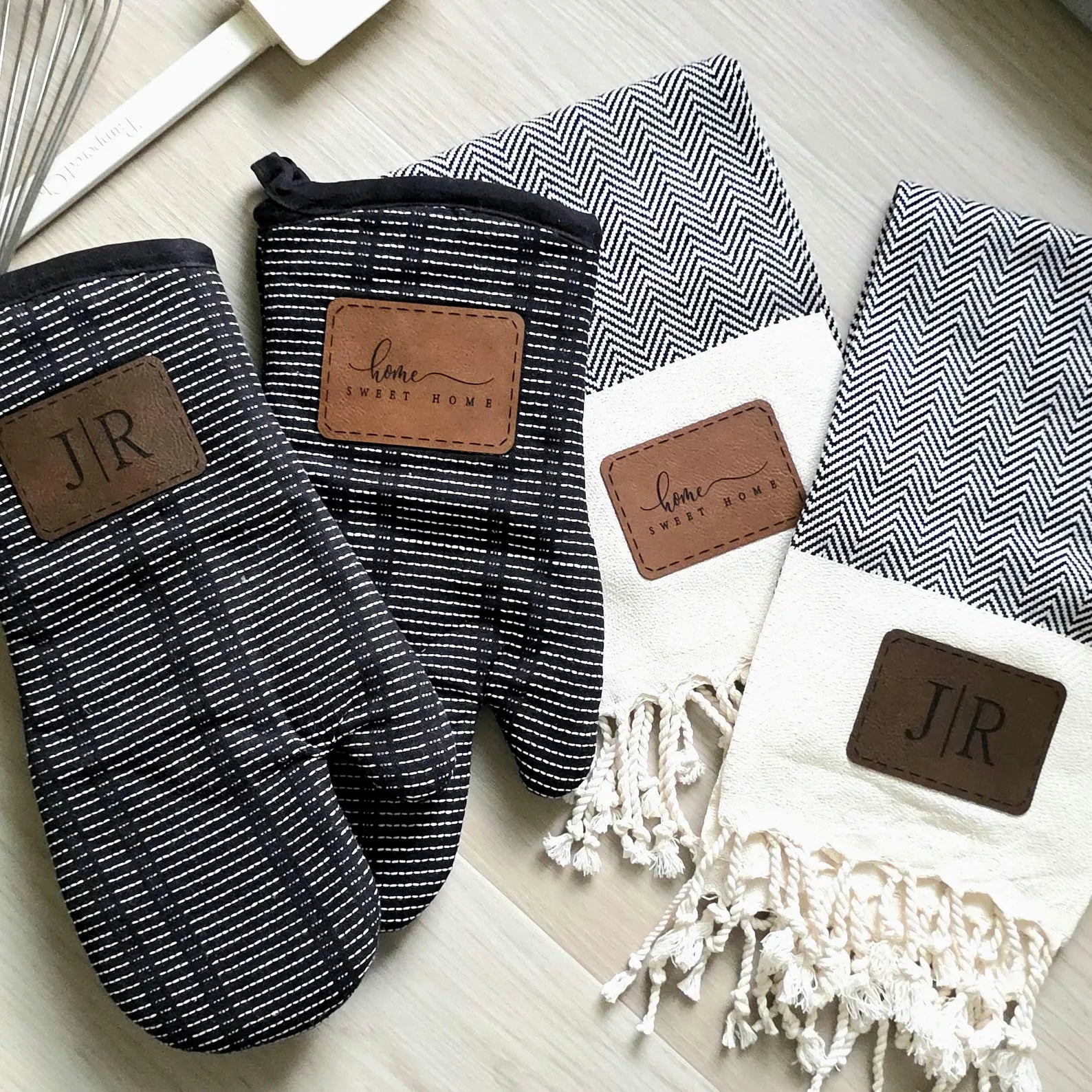 A stylish oven mitt and kitchen towel set featuring a custom engraved leather patch. Perfect for housewarming gifts, holiday baskets, bakers, and anyone who loves a beautifully coordinated kitchen.